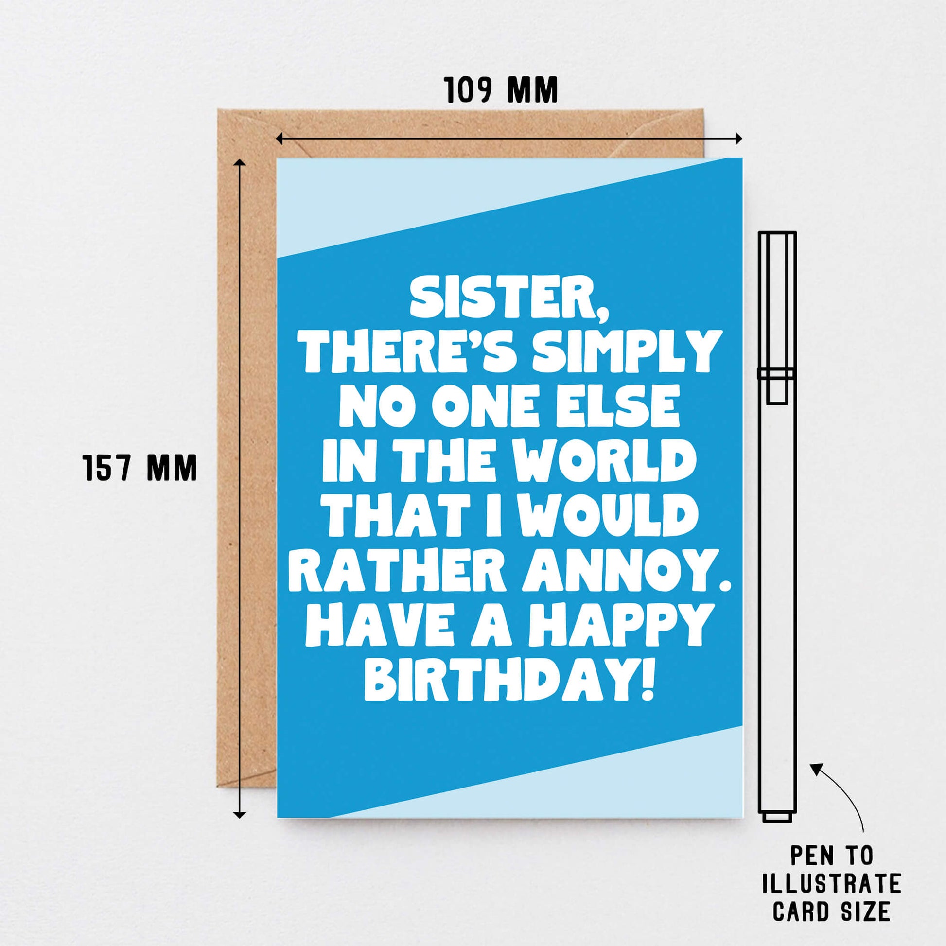 The perfect birthday card for the sister you love to annoy. Send this to her and it's sure to raise a smile! We hope.