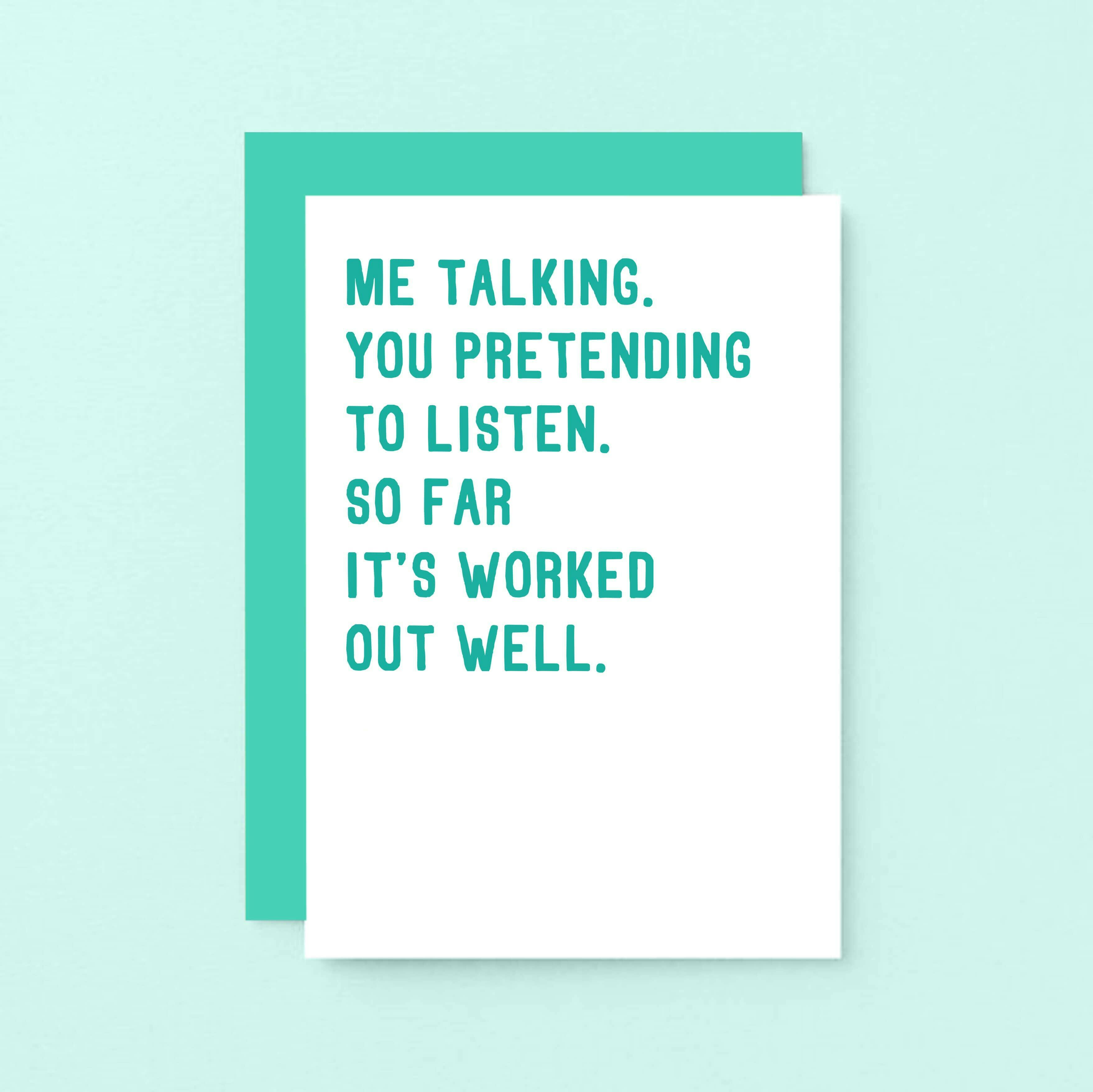 Me talking. You pretending to listen. Is this a familiar scenario? Share a funny message with your significant other, spouse, partner when you give this playful greeting card. Works for an anniversary, birthday or Valentine's Day.